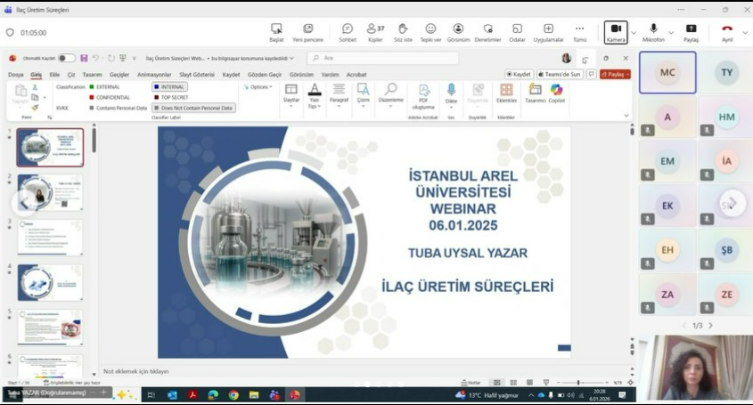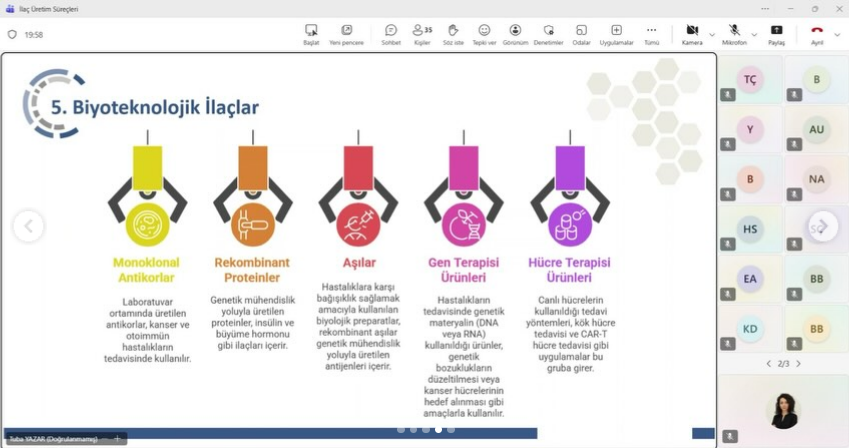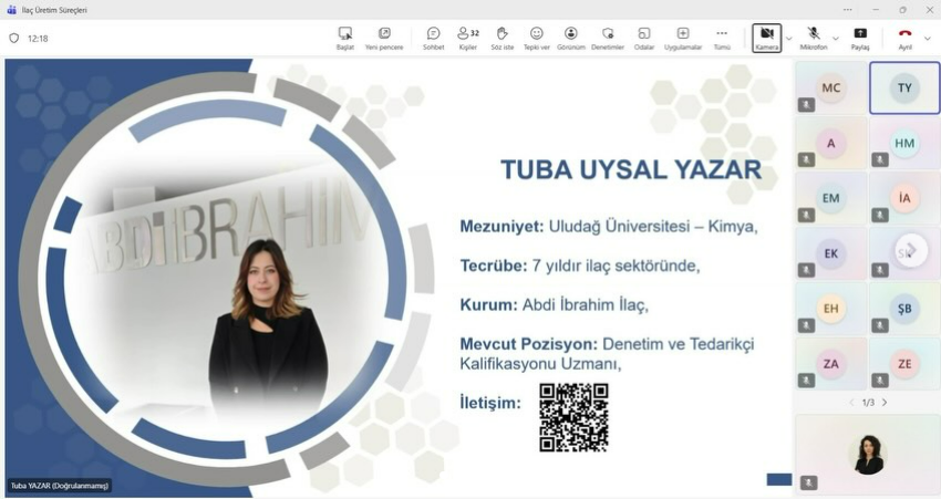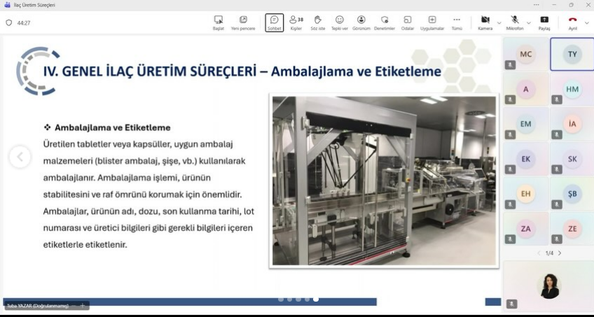 Eczane Hizmetleri Programı olarak Abdi İbrahim İlaç Denetim ve Tedarikçi Kalifikasyon Uzmanı Kimyager Tuba UYSAL YAZAR ile birlikte olduk. İlaçların Sınıflandırılmasından, Etki Mekanizmalarına, İlaç Üretim Süreçlerinden, Saklama Koşullarının Belirlenmesine kadar farklı başlıklarda ilaç üretimine dair çok kıymetli bilgiler edindik. İlaç Üretim alanındaki paylaştığı mesleki tecrübesi ve öğrencilerimize sunduğu faydalı bilgiler için kıymetli hocamıza çok teşekkür ederiz.
