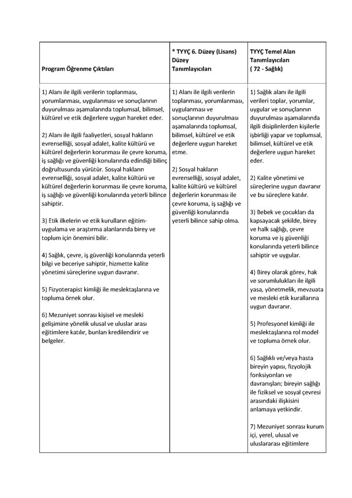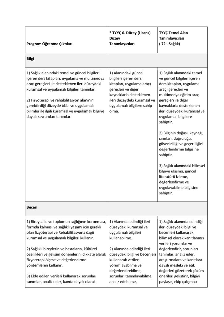 Birey, aile ve toplumun sağlığının korunması, formda kalması ve sağlıklı yaşamı için gerekli olan fizyoterapi ve Rehabilitasyona özgü kuramsal ve uygulamalı bilgileri kullanır.