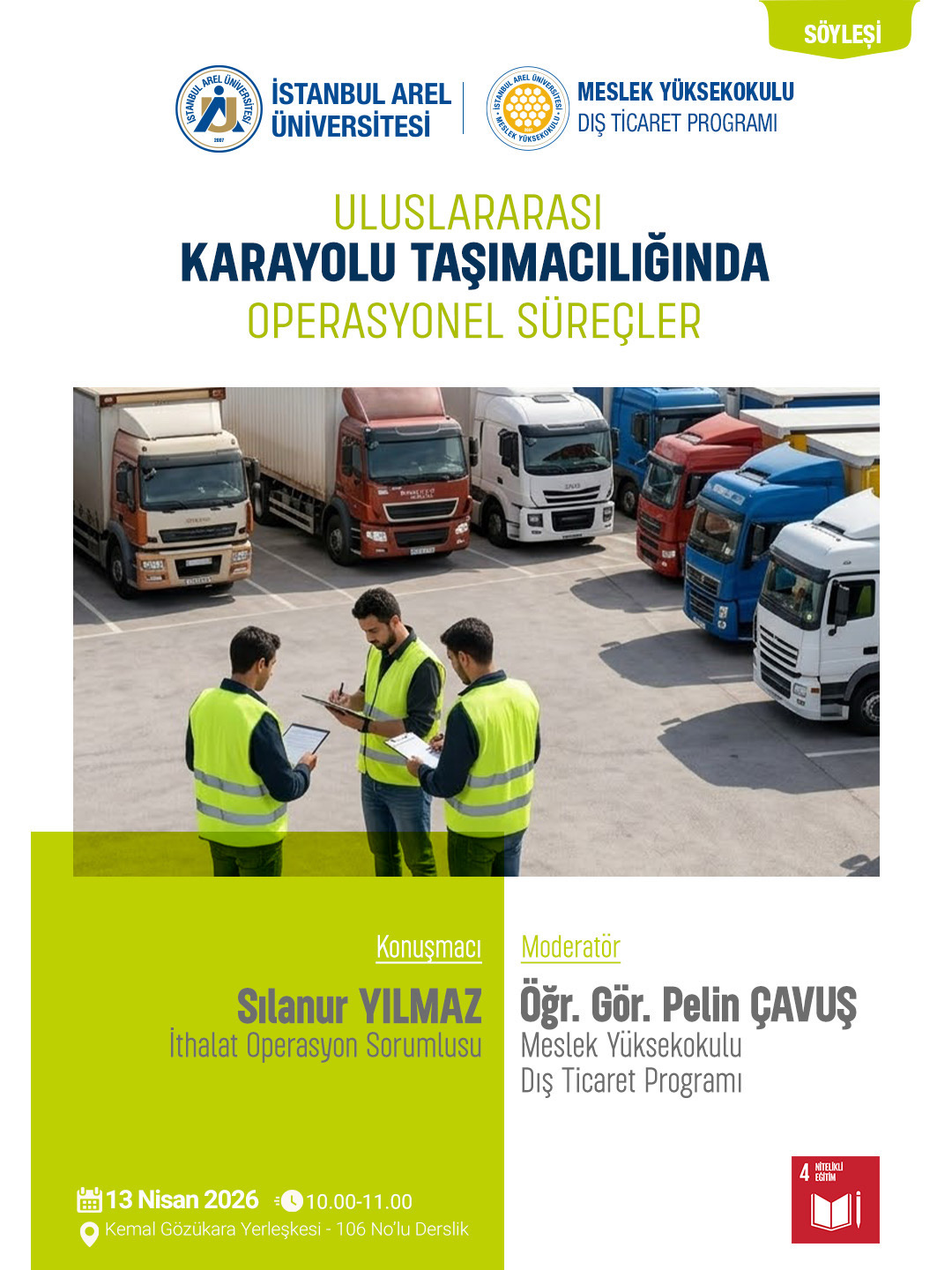 Dış Ticaret Programı tarafından düzenlenen “Uluslararası Karayolu Taşımacılığında Operasyonel Süreçler” başlıklı söyleşi, 13 Nisan 2026 tarihinde Kemal Gözükara Yerleşkesi’nde başarıyla gerçekleştirildi.